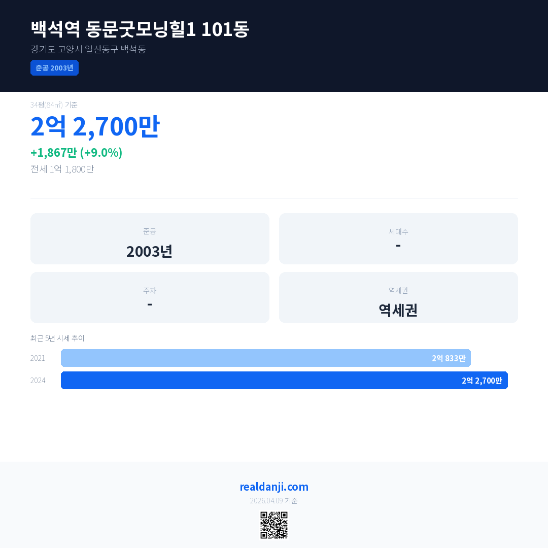 백석역 동문굿모닝힐1 101동은(는) 2003년에 준공되었으며, 현재 23년차입니다.