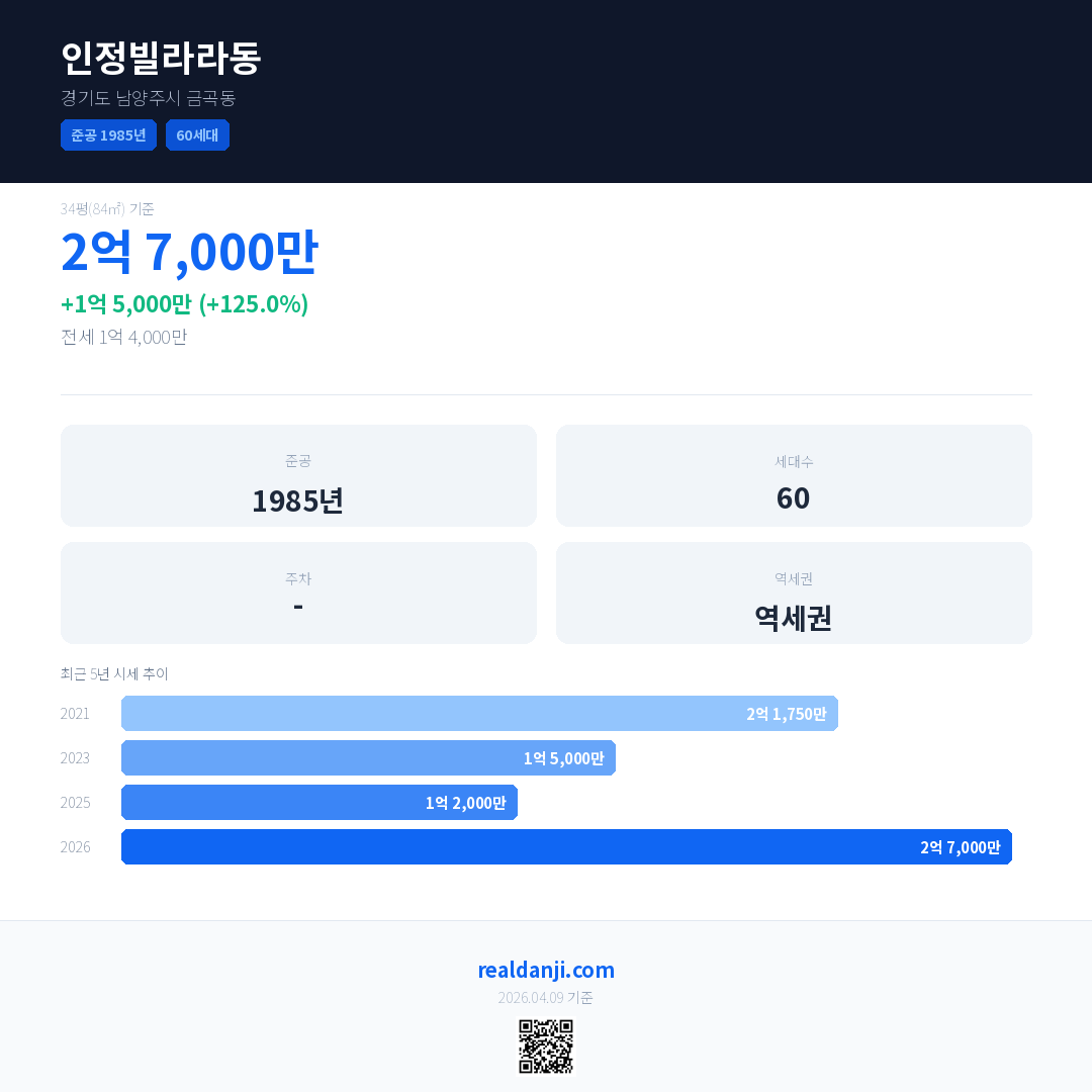 인정빌라라동 국민평형 기준 2026년 평균 거래가는 2억 7,000만으로, 전년 대비 125.0% 상승 했습니다.