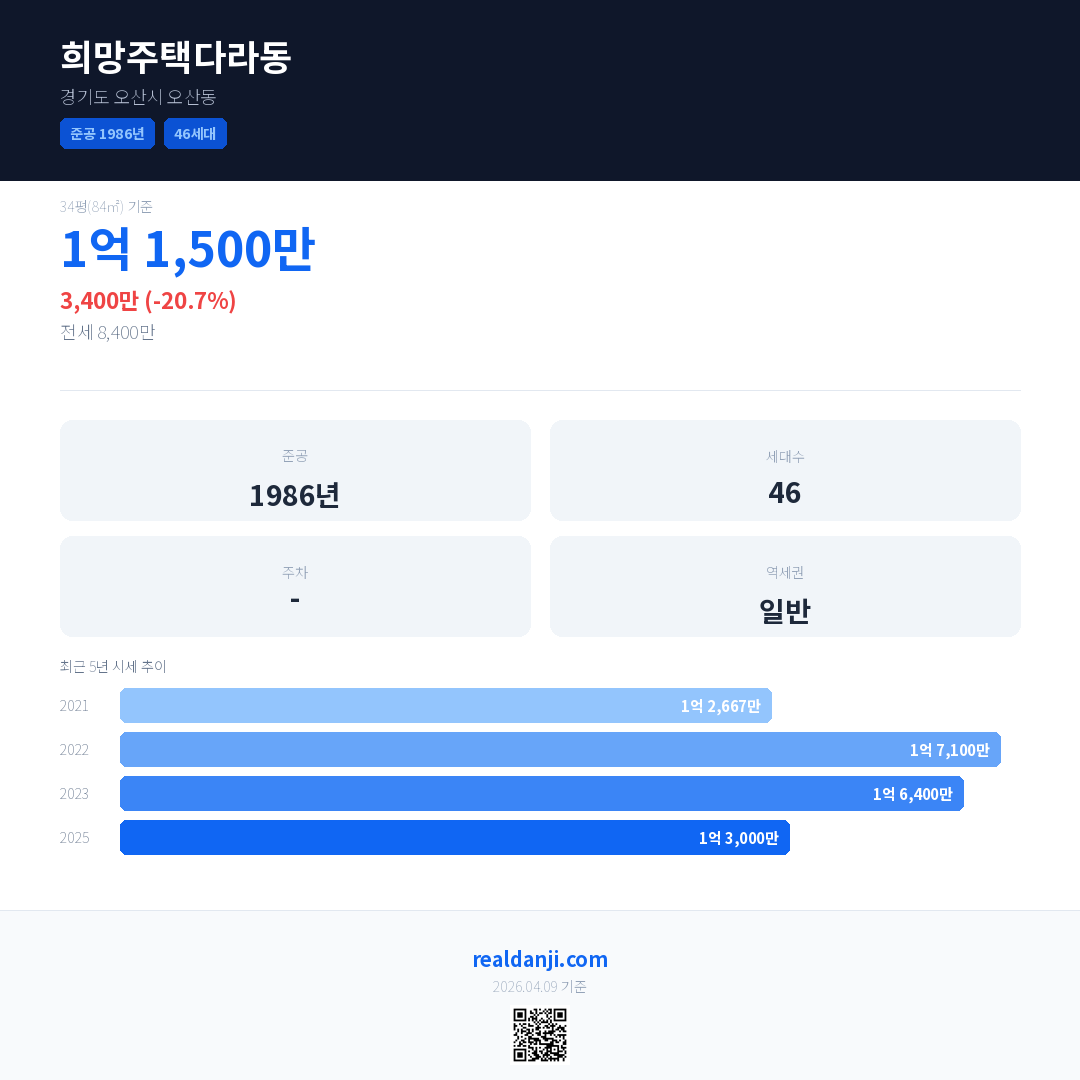 희망주택다라동 국민평형 기준 2025년 평균 거래가는 1억 3,000만으로, 전년 대비 20.7% 하락 했습니다.