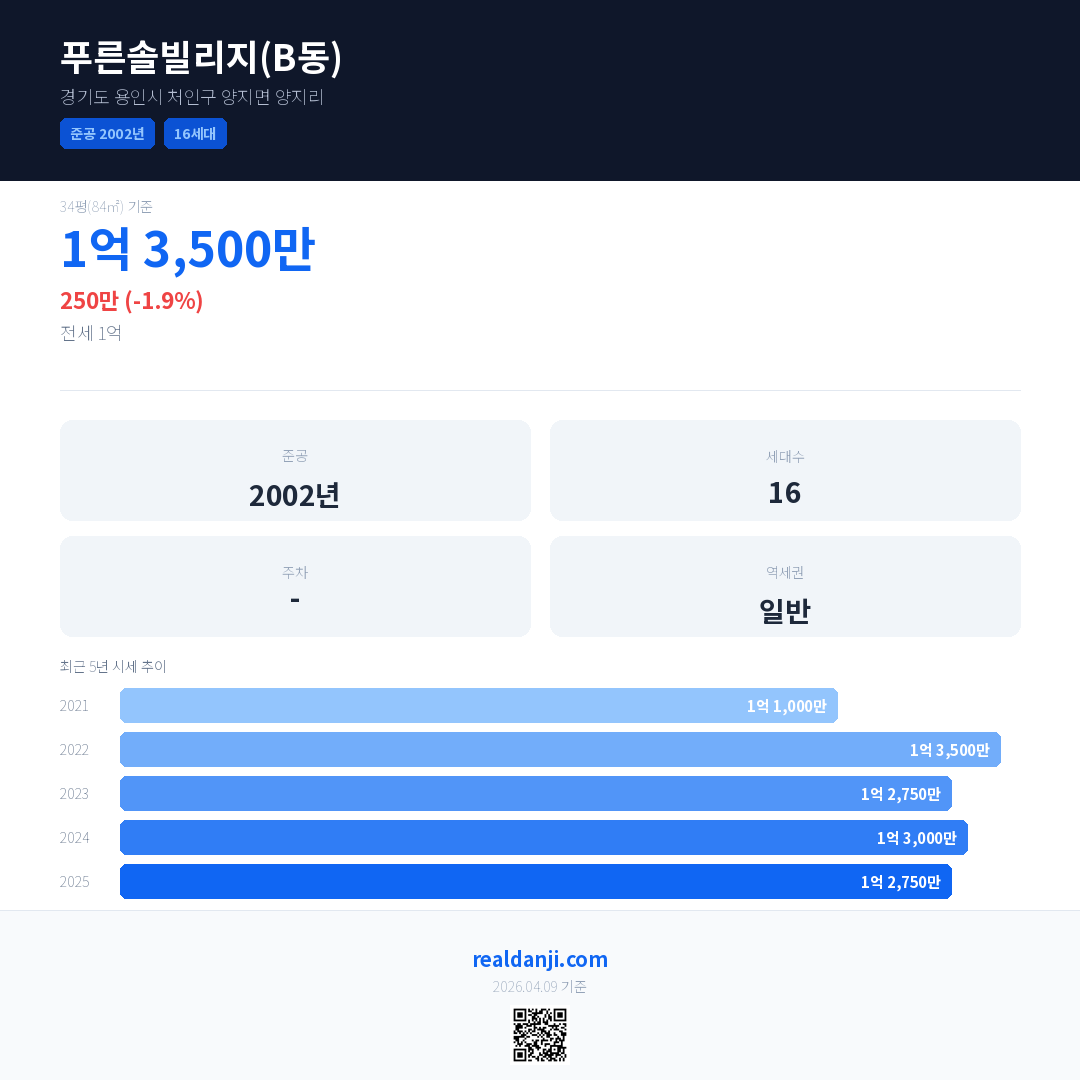 푸른솔빌리지(B동) 최근 거래가는 1억 3,500만입니다. (2026-02)