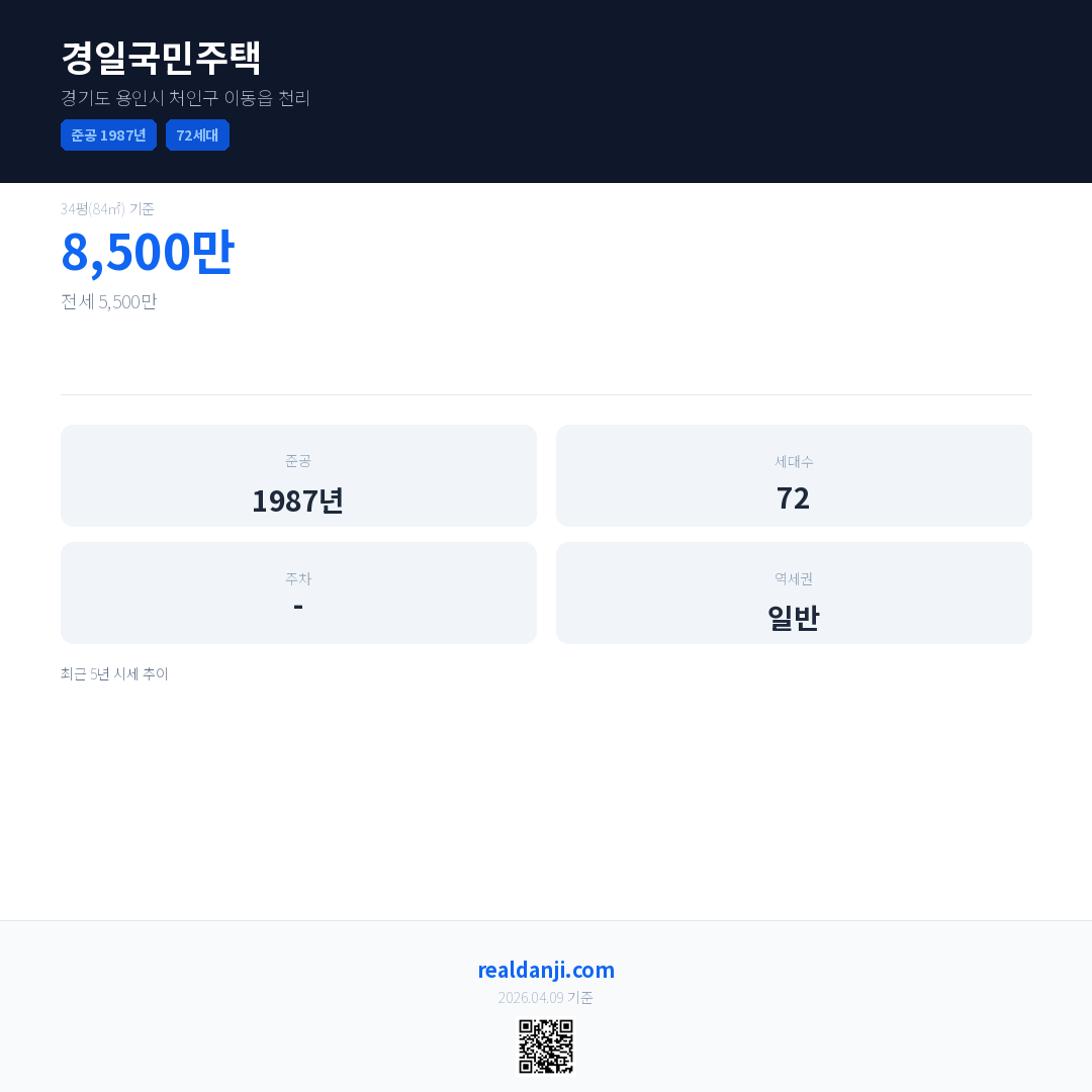 경일국민주택 최근 거래가는 8,500만입니다. (2024-01)