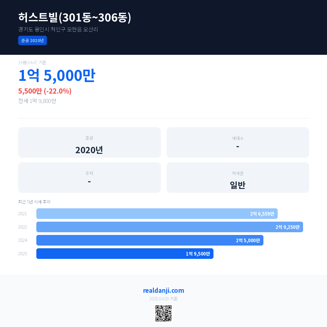 허스트빌(301동~306동) 국민평형 기준 2025년 평균 거래가는 1억 9,500만으로, 전년 대비 22.0% 하락 했습니다.