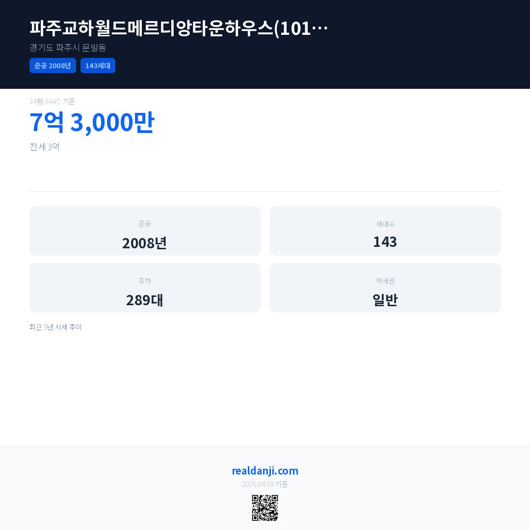 파주교하월드메르디앙타운하우스(101동-109동)은(는) 2008년에 준공되었으며, 현재 18년차입니다. 총 143세대 규모입니다.