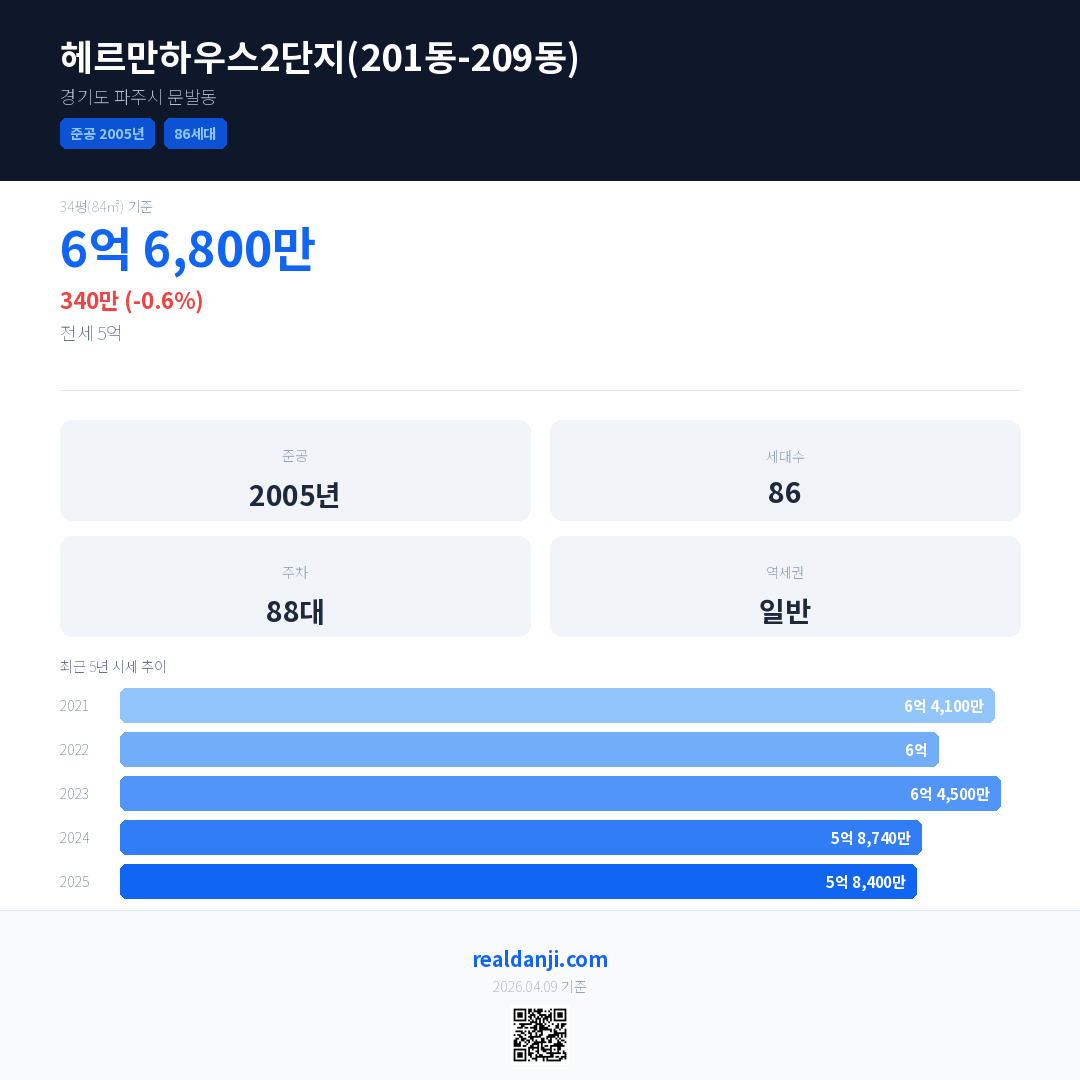 헤르만하우스2단지(201동-209동) 국민평형 기준 2025년 평균 거래가는 5억 8,400만으로, 전년 대비 0.6% 하락 했습니다.