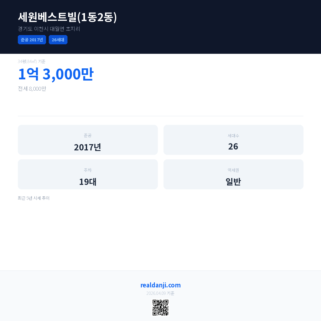 세원베스트빌(1동2동) 최근 거래가는 1억 3,000만입니다. (2026-03)