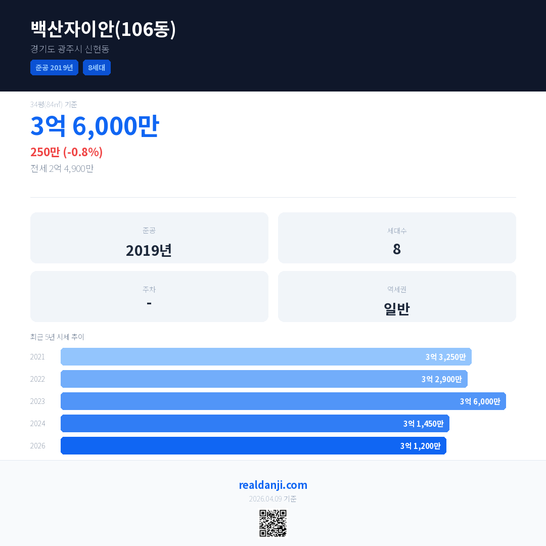 백산자이안(106동)은(는) 2019년에 준공되었으며, 현재 7년차입니다. 총 8세대 규모입니다.