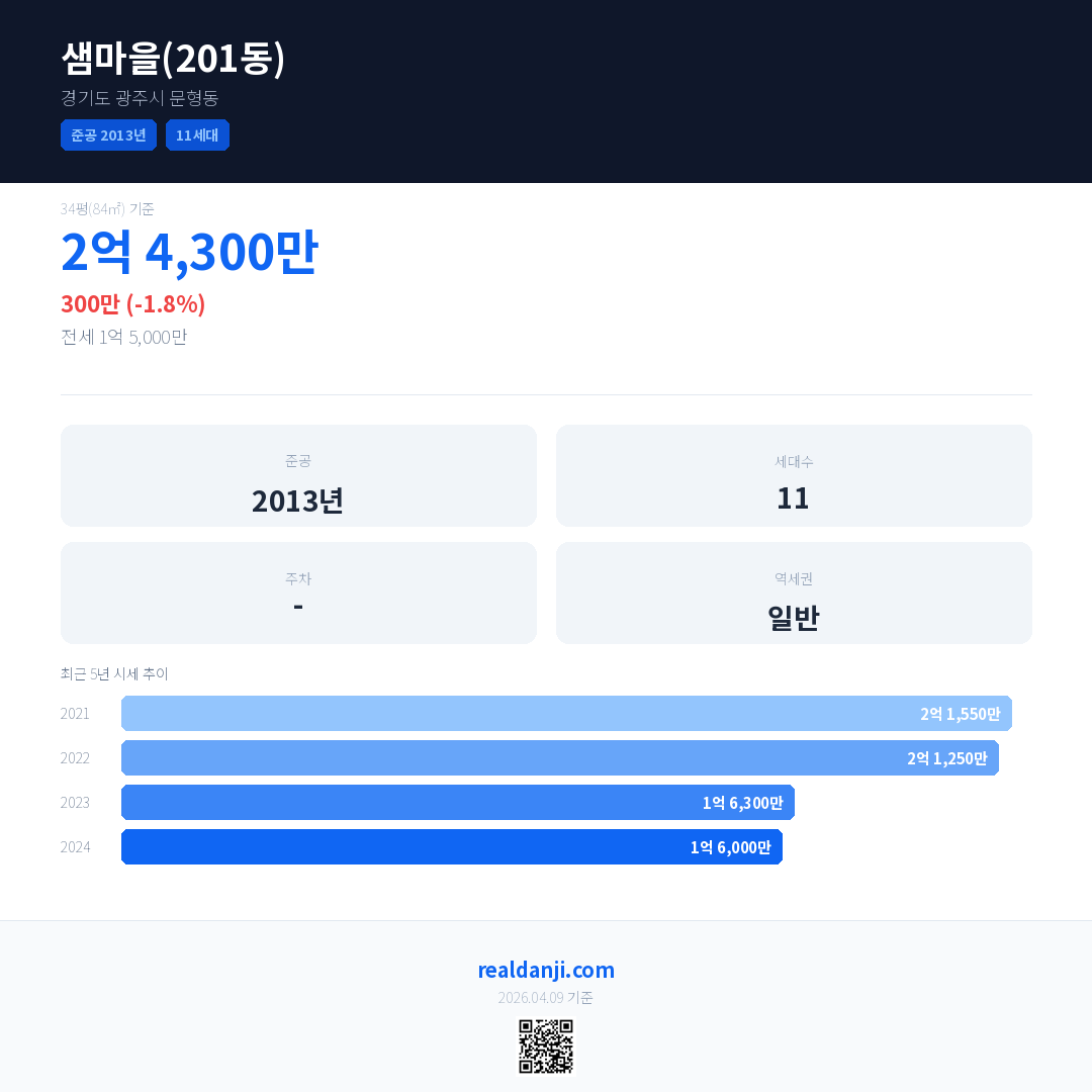 샘마을(201동)은(는) 2013년에 준공되었으며, 현재 13년차입니다. 총 11세대 규모입니다.