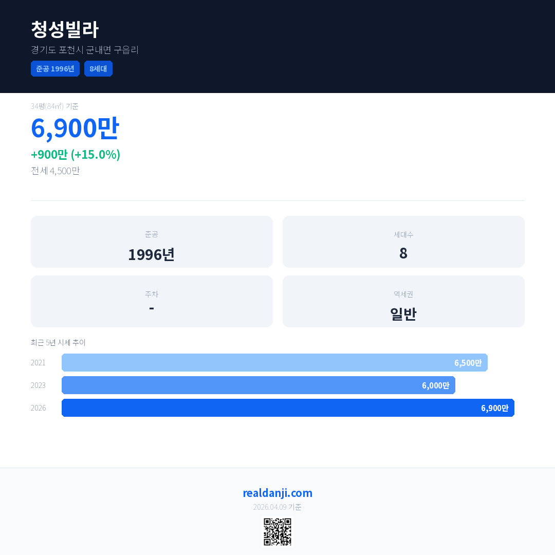 청성빌라 국민평형 기준 2026년 평균 거래가는 6,900만으로, 전년 대비 15.0% 상승 했습니다.