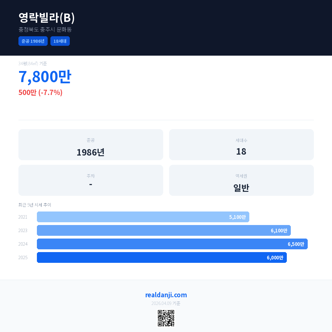 영락빌라(B) 국민평형 기준 2025년 평균 거래가는 6,000만으로, 전년 대비 7.7% 하락 했습니다.