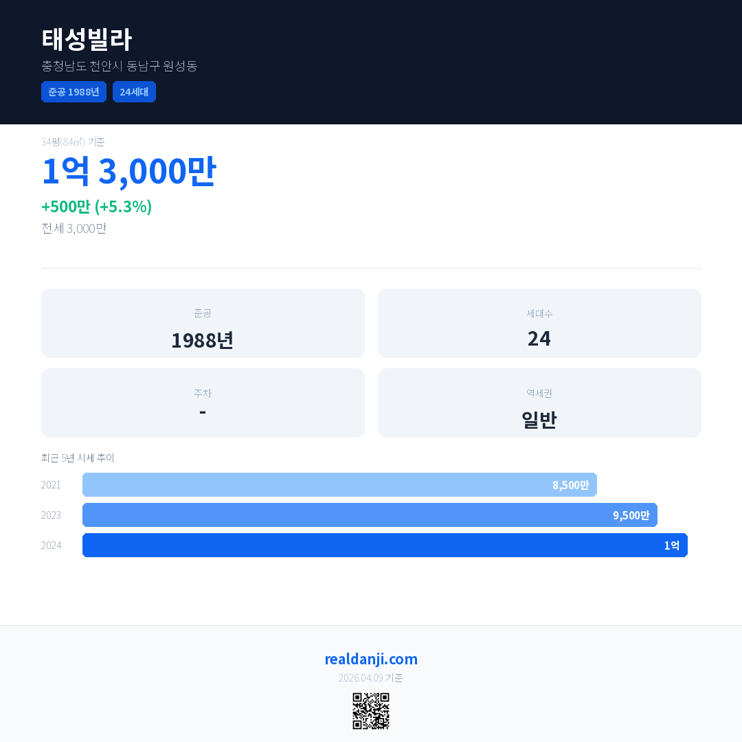 태성빌라 국민평형 기준 2024년 평균 거래가는 1억으로, 전년 대비 5.3% 상승 했습니다.