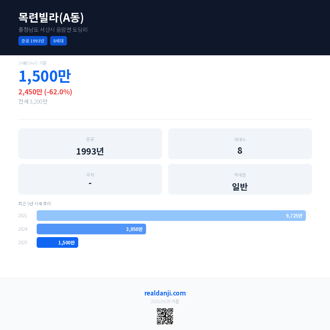 목련빌라(A동) 국민평형 기준 2025년 평균 거래가는 1,500만으로, 전년 대비 62.0% 하락 했습니다.