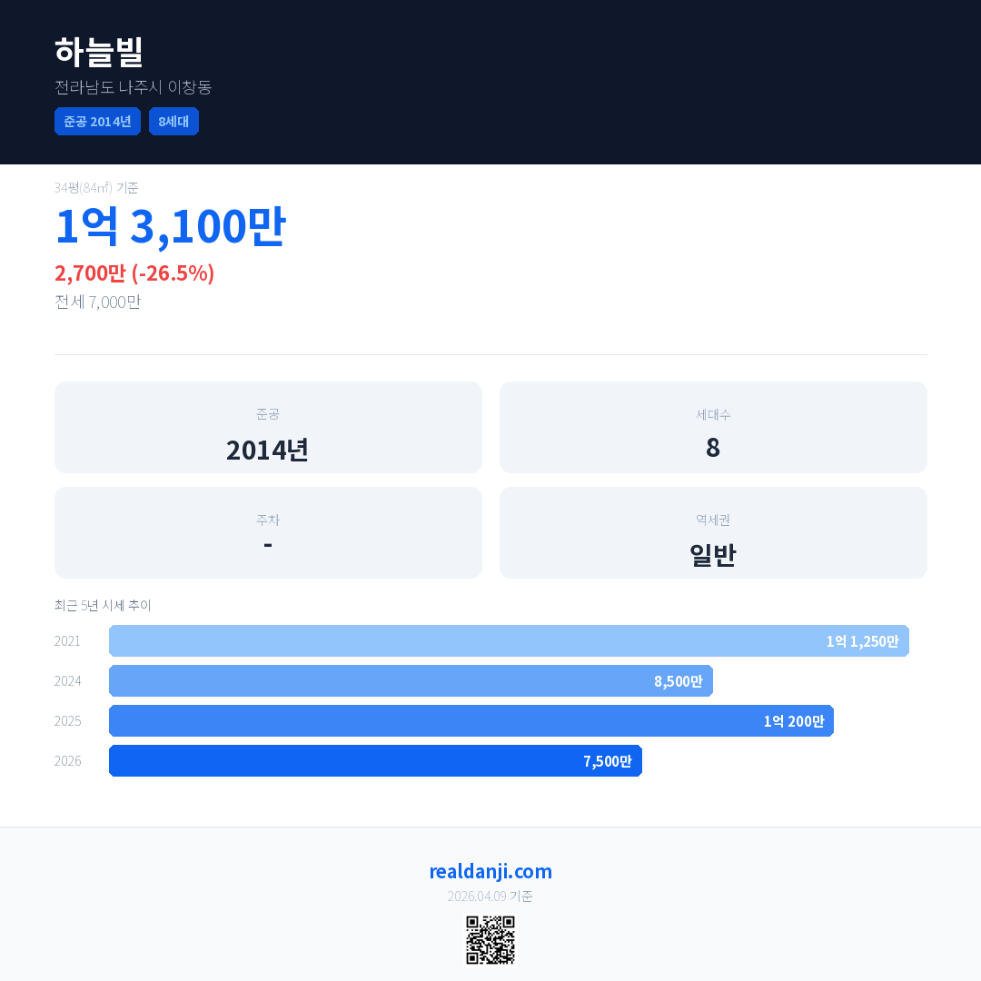 하늘빌 최근 거래가는 1억 3,100만입니다. (2026-02)