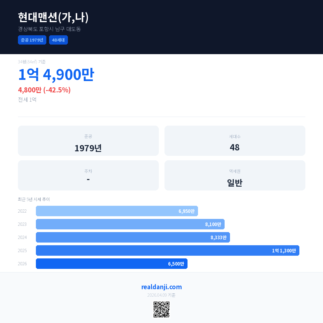 현대맨션(가,나) 국민평형 기준 2026년 평균 거래가는 6,500만으로, 전년 대비 42.5% 하락 했습니다.