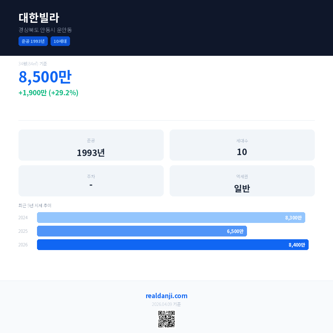 대한빌라 국민평형 기준 2026년 평균 거래가는 8,400만으로, 전년 대비 29.2% 상승 했습니다.