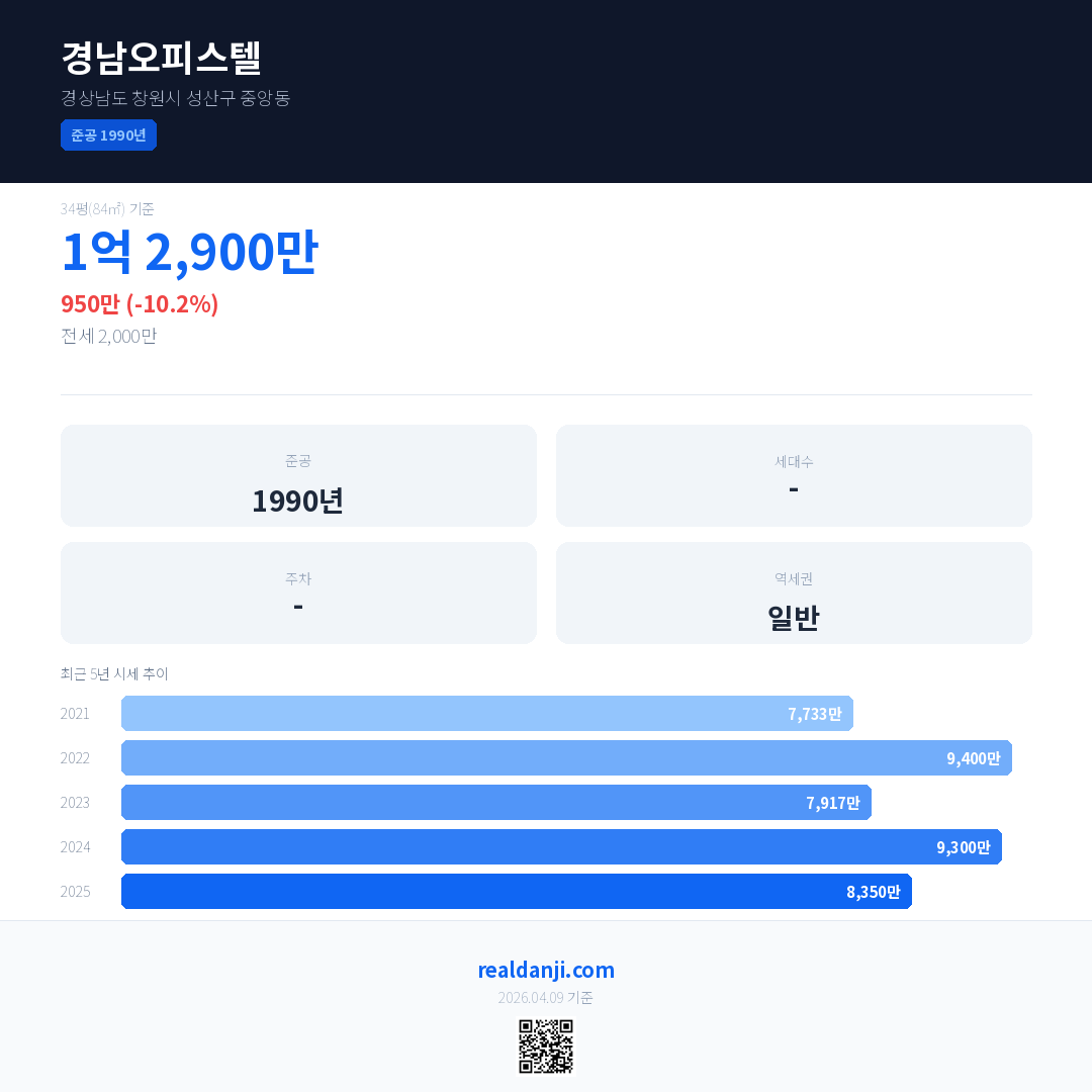 경남오피스텔 국민평형 기준 2025년 평균 거래가는 8,350만으로, 전년 대비 10.2% 하락 했습니다.