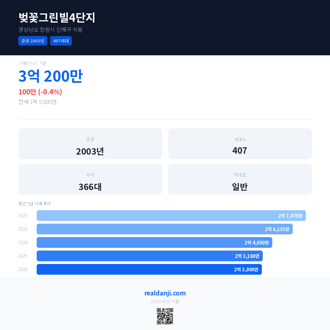 벚꽃그린빌4단지 국민평형 기준 2026년 평균 거래가는 2억 3,000만으로, 전년 대비 0.4% 하락 했습니다.