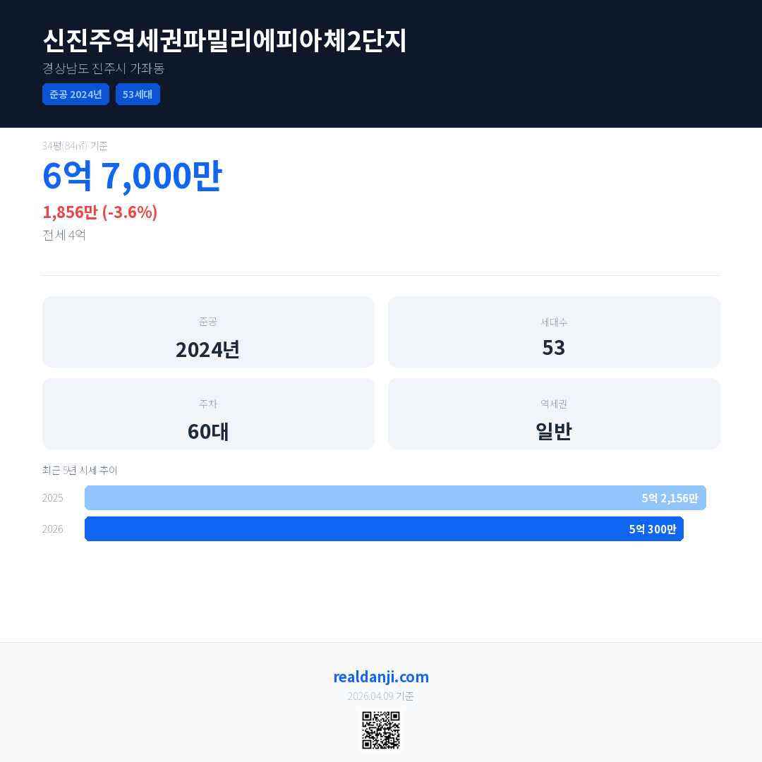 신진주역세권파밀리에피아체2단지 국민평형 기준 2026년 평균 거래가는 5억 300만으로, 전년 대비 3.6% 하락 했습니다.