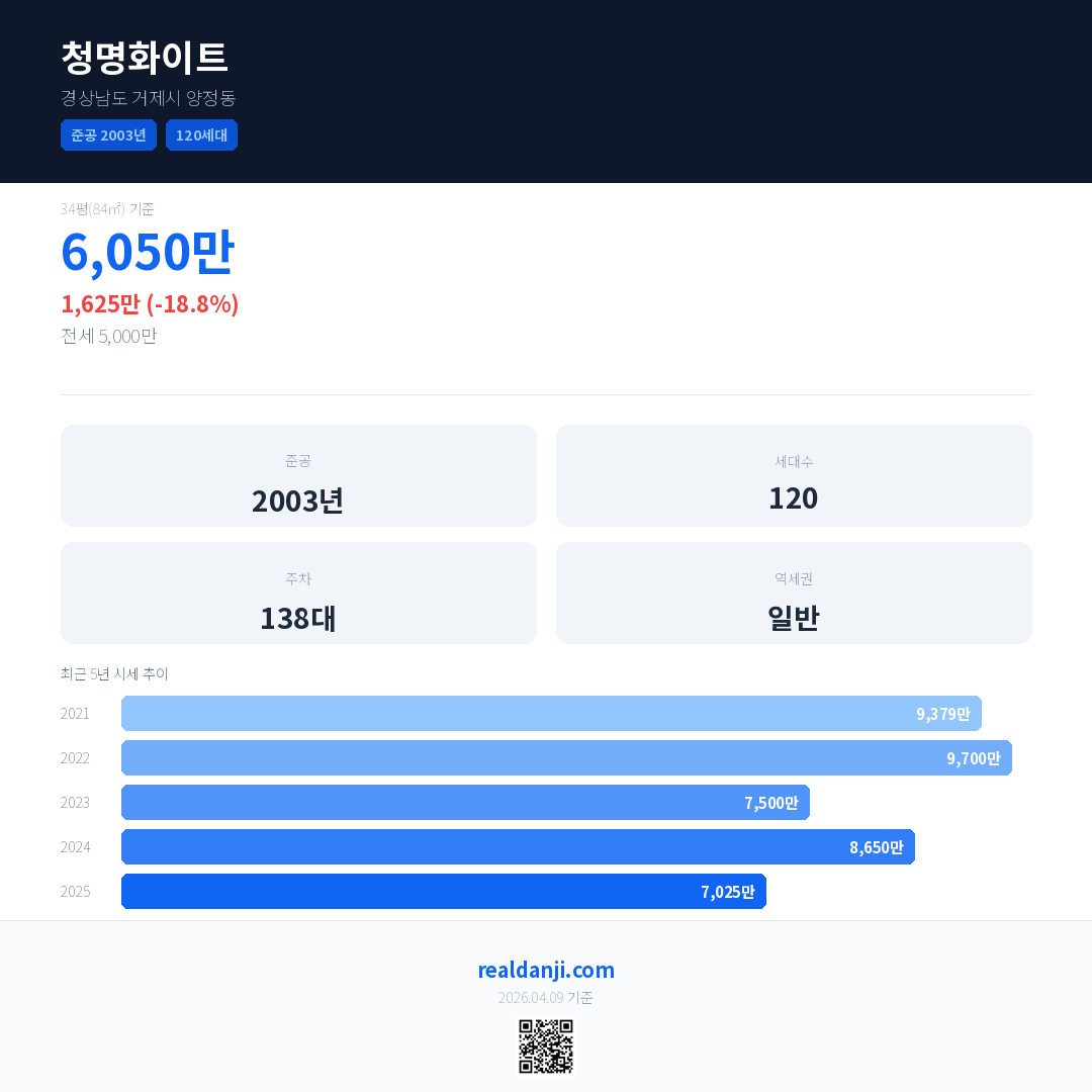 청명화이트 국민평형 기준 2025년 평균 거래가는 7,025만으로, 전년 대비 18.8% 하락 했습니다.