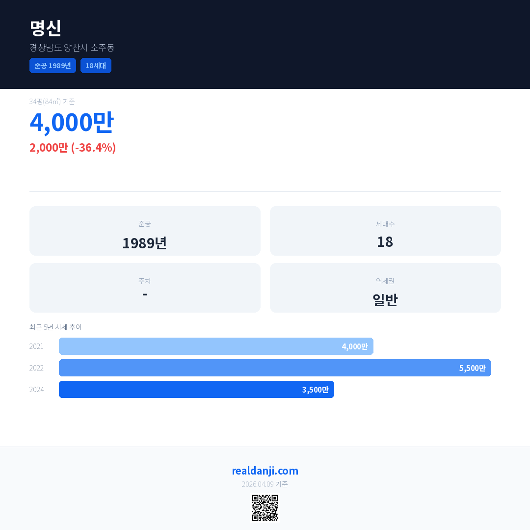명신 국민평형 기준 2024년 평균 거래가는 3,500만으로, 전년 대비 36.4% 하락 했습니다.