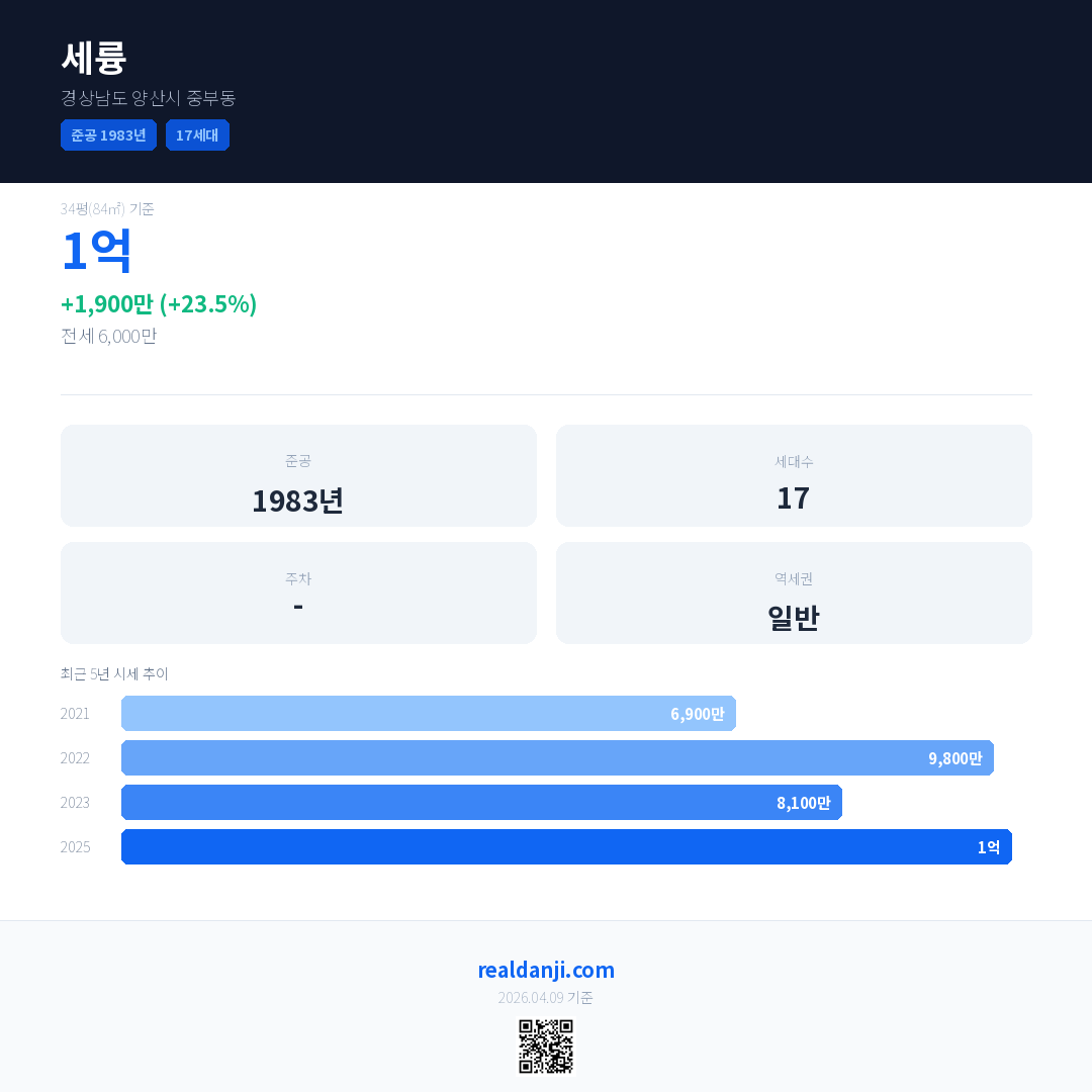 세륭 국민평형 기준 2025년 평균 거래가는 1억으로, 전년 대비 23.5% 상승 했습니다.