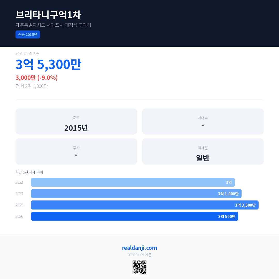 브리타니구억1차 국민평형 기준 2026년 평균 거래가는 3억 500만으로, 전년 대비 9.0% 하락 했습니다.