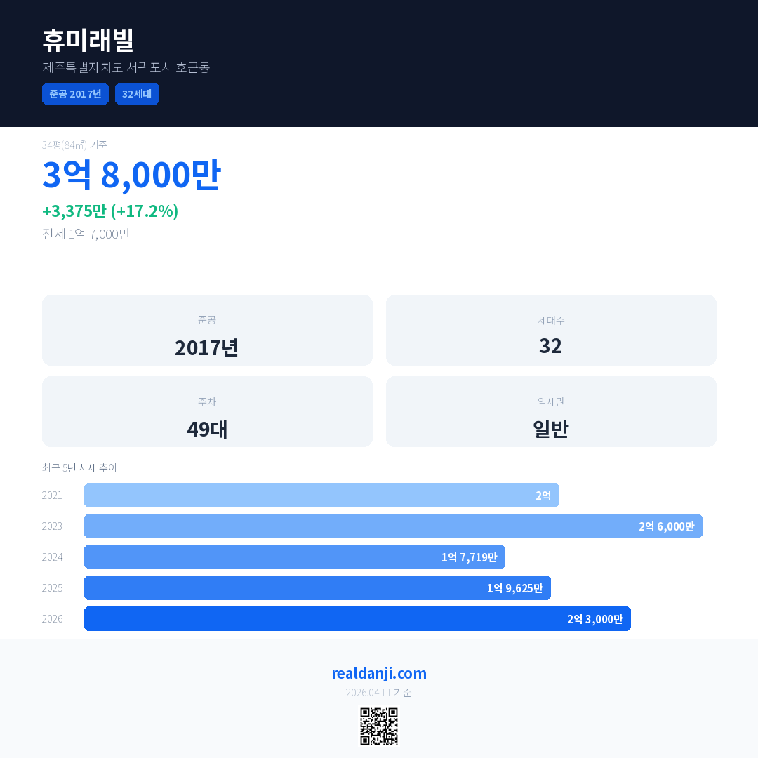 휴미래빌 국민평형 기준 2026년 평균 거래가는 2억 3,000만으로, 전년 대비 17.2% 상승 했습니다.