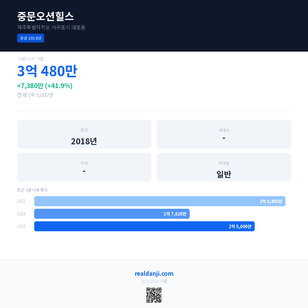중문오션힐스 국민평형 기준 2025년 평균 거래가는 2억 5,000만으로, 전년 대비 41.9% 상승 했습니다.