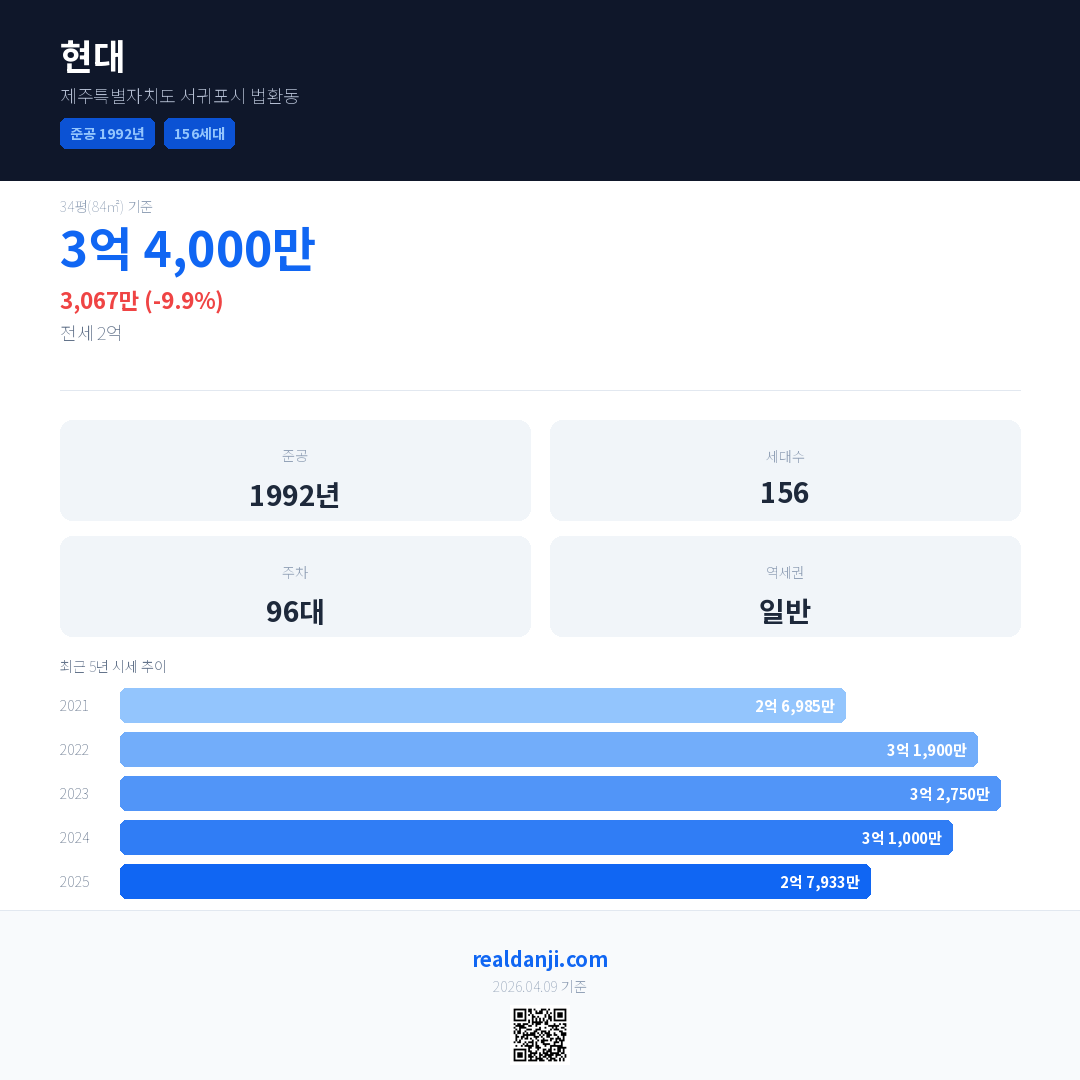 현대 국민평형 기준 2025년 평균 거래가는 2억 7,933만으로, 전년 대비 9.9% 하락 했습니다.
