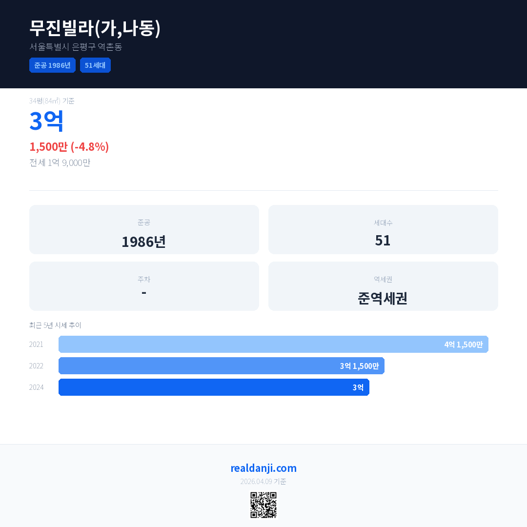 무진빌라(가,나동)은(는) 1986년에 준공되었으며, 현재 40년차입니다. 총 51세대 규모입니다.