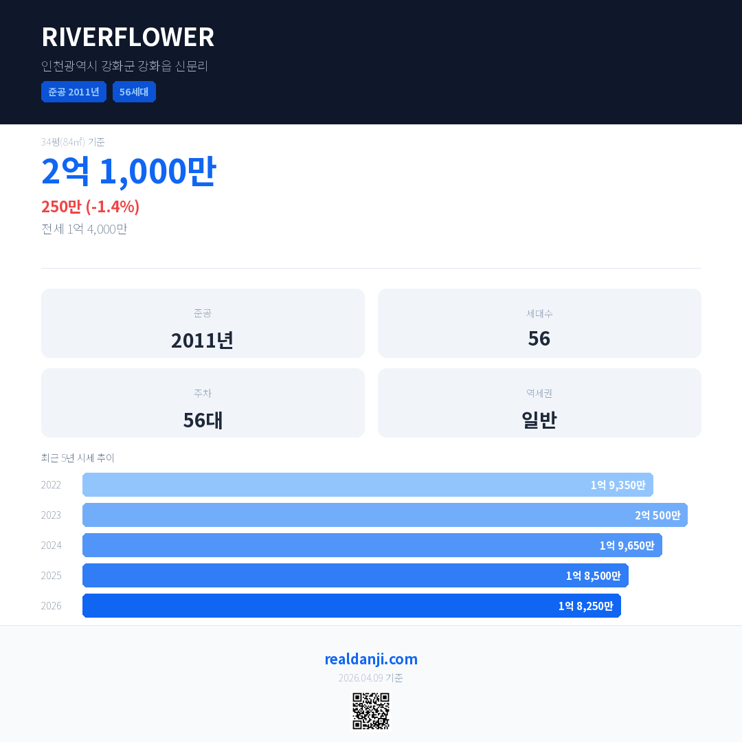 RIVERFLOWER 국민평형 기준 2026년 평균 거래가는 1억 8,250만으로, 전년 대비 1.4% 하락 했습니다.