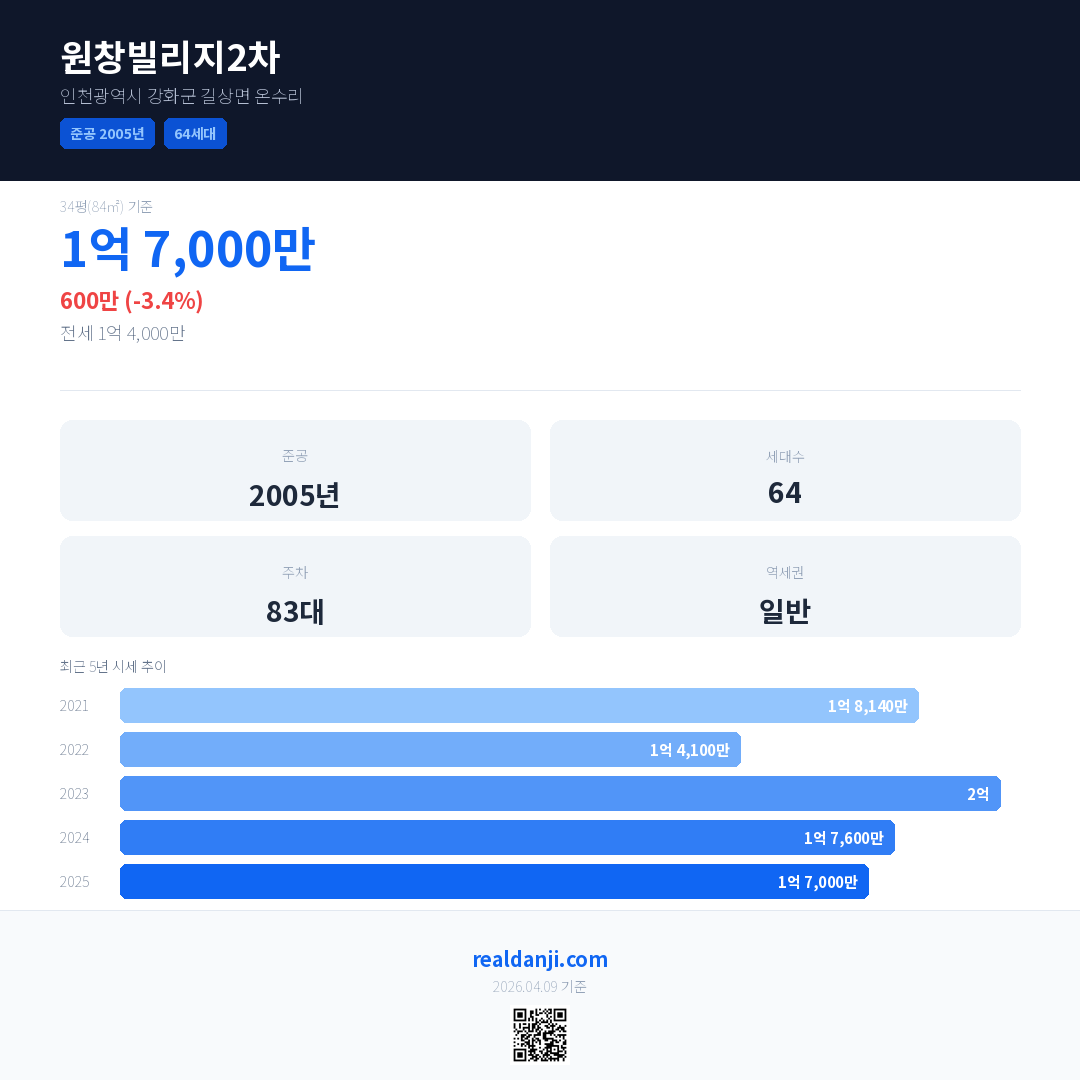 원창빌리지2차 최근 거래가는 2억 1,000만입니다. (2025-06)