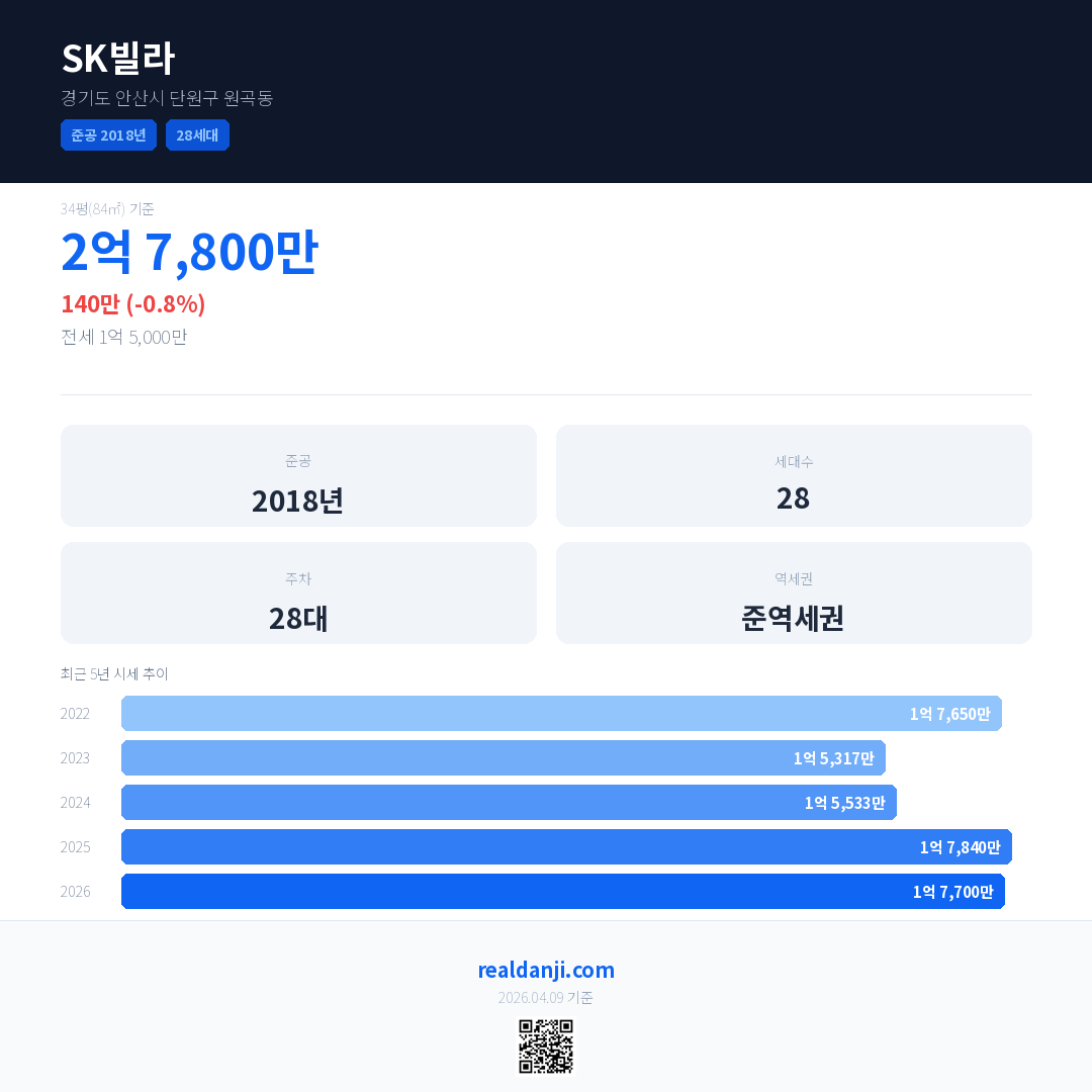 SK빌라 국민평형 기준 2026년 평균 거래가는 1억 7,700만으로, 전년 대비 0.8% 하락 했습니다.