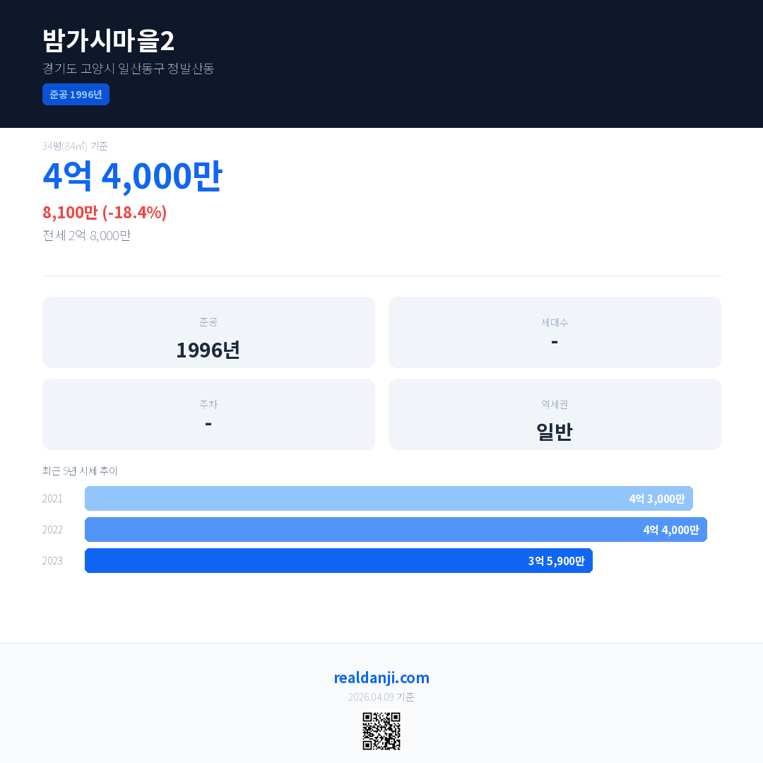 밤가시마을2 국민평형 기준 2023년 평균 거래가는 3억 5,900만으로, 전년 대비 18.4% 하락 했습니다.