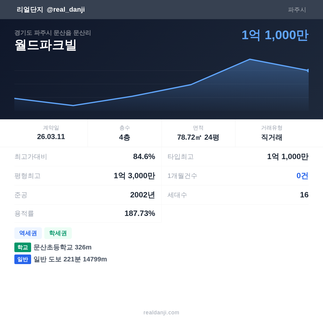 월드파크빌 국민평형 기준 2026년 평균 거래가는 1억 1,000만으로, 전년 대비 4.3% 하락 했습니다.