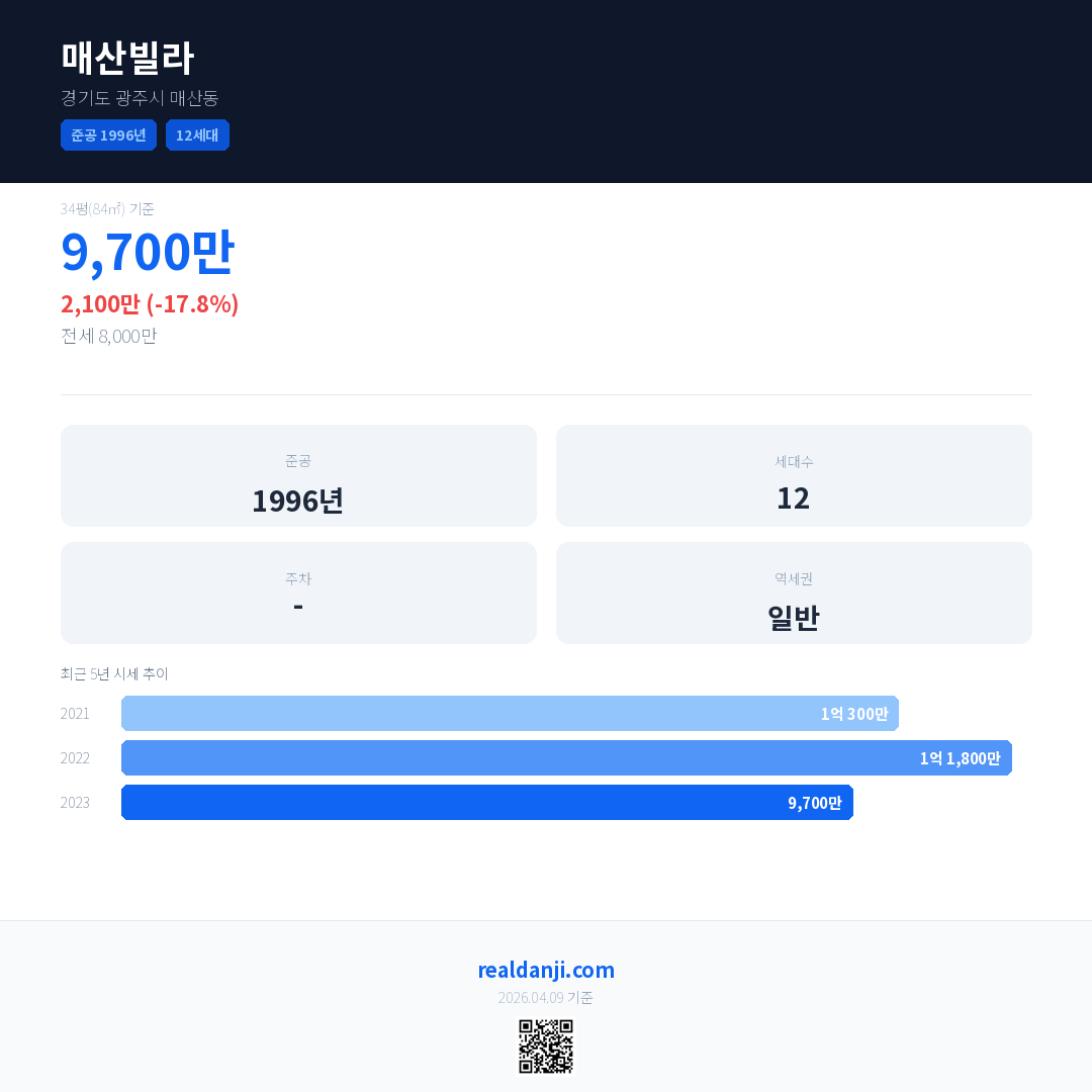 매산빌라 국민평형 기준 2023년 평균 거래가는 9,700만으로, 전년 대비 17.8% 하락 했습니다.