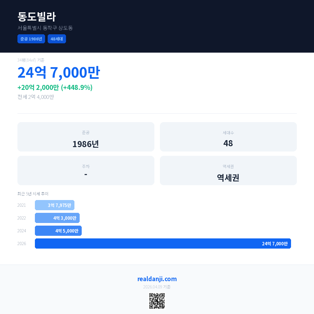 동도빌라 국민평형 기준 2026년 평균 거래가는 24억 7,000만으로, 전년 대비 448.9% 상승 했습니다.