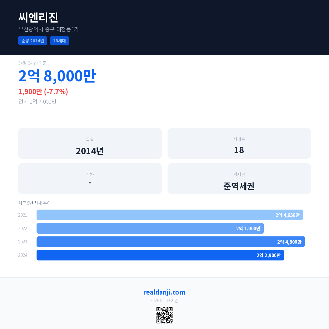 씨엔리진 국민평형 기준 2024년 평균 거래가는 2억 2,900만으로, 전년 대비 7.7% 하락 했습니다.