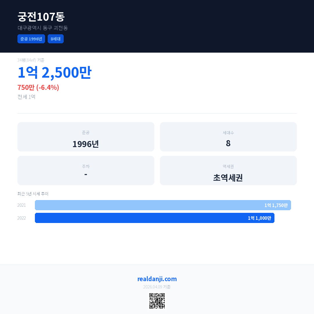궁전107동 최근 거래가는 1억 2,500만입니다. (2022-09)