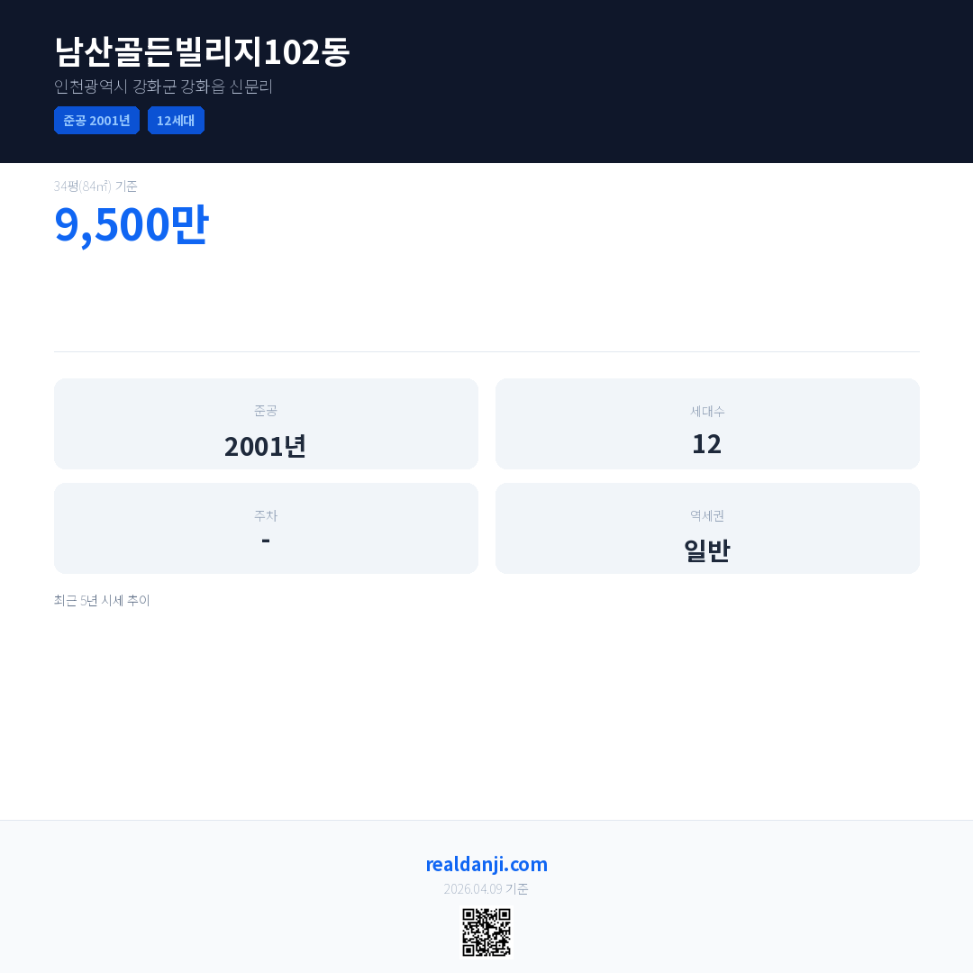 남산골든빌리지102동은(는) 2001년에 준공되었으며, 현재 25년차입니다. 총 12세대 규모입니다.