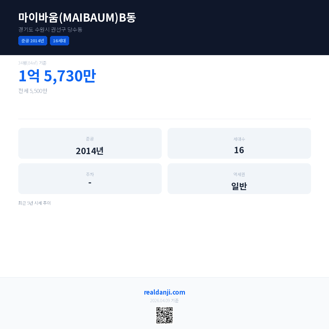 마이바움(MAIBAUM)B동은(는) 2014년에 준공되었으며, 현재 12년차입니다. 총 16세대 규모입니다.