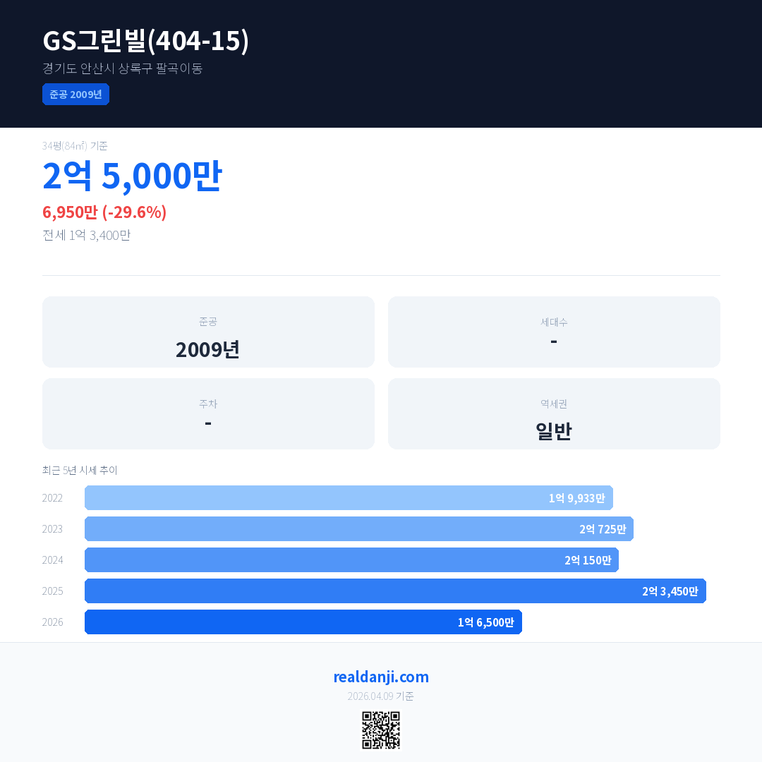 GS그린빌(404-15) 최근 거래가는 1억 6,500만입니다. (2026-04)