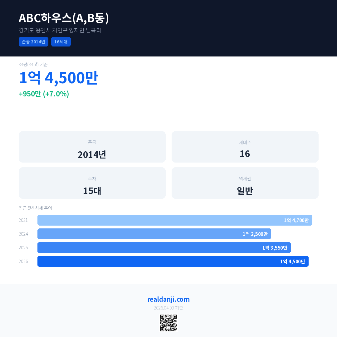 ABC하우스(A,B동) 국민평형 기준 2026년 평균 거래가는 1억 4,500만으로, 전년 대비 7.0% 상승 했습니다.