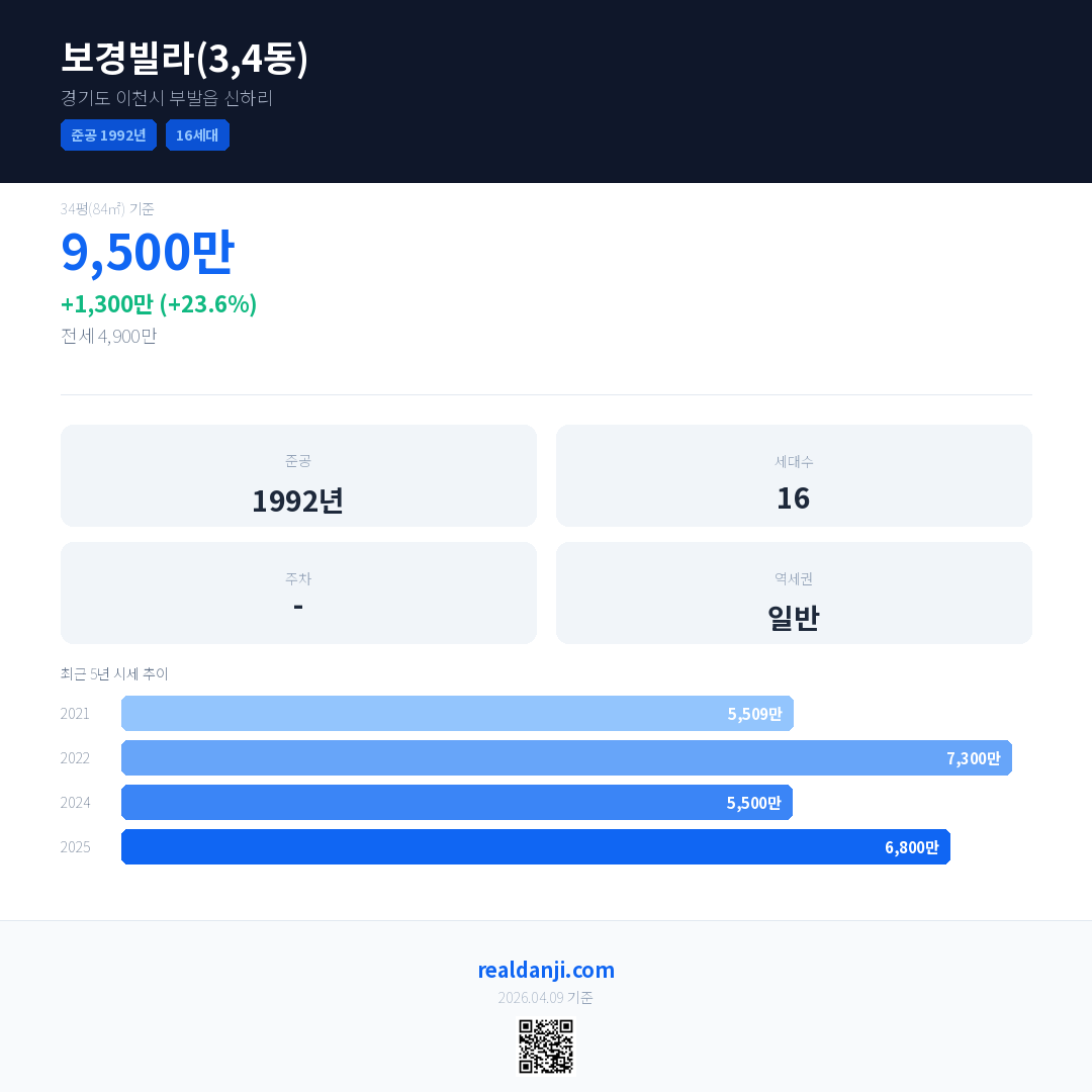 보경빌라(3,4동) 최근 거래가는 9,500만입니다. (2025-04)