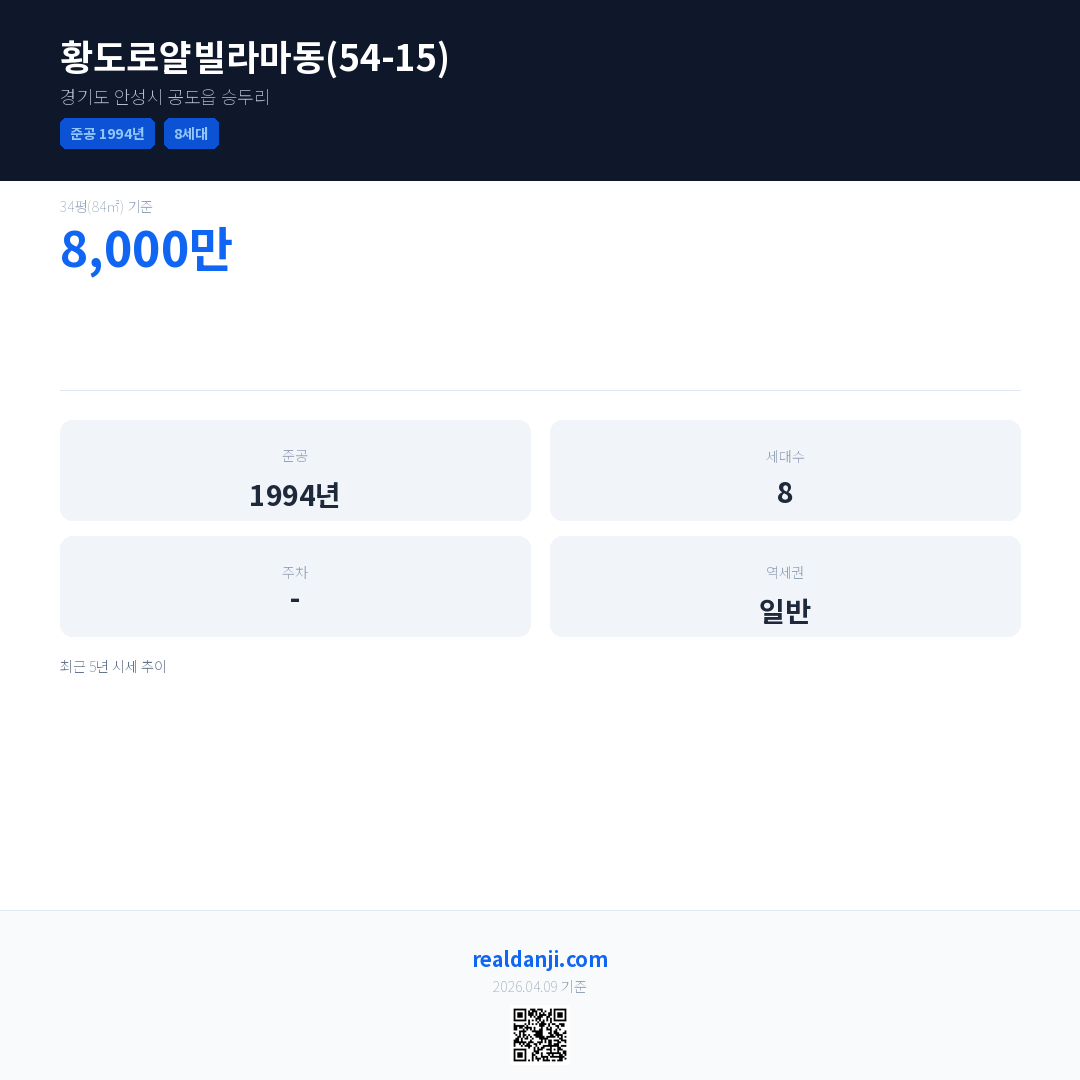 황도로얄빌라마동(54-15)은(는) 1994년에 준공되었으며, 현재 32년차입니다. 총 8세대 규모입니다.
