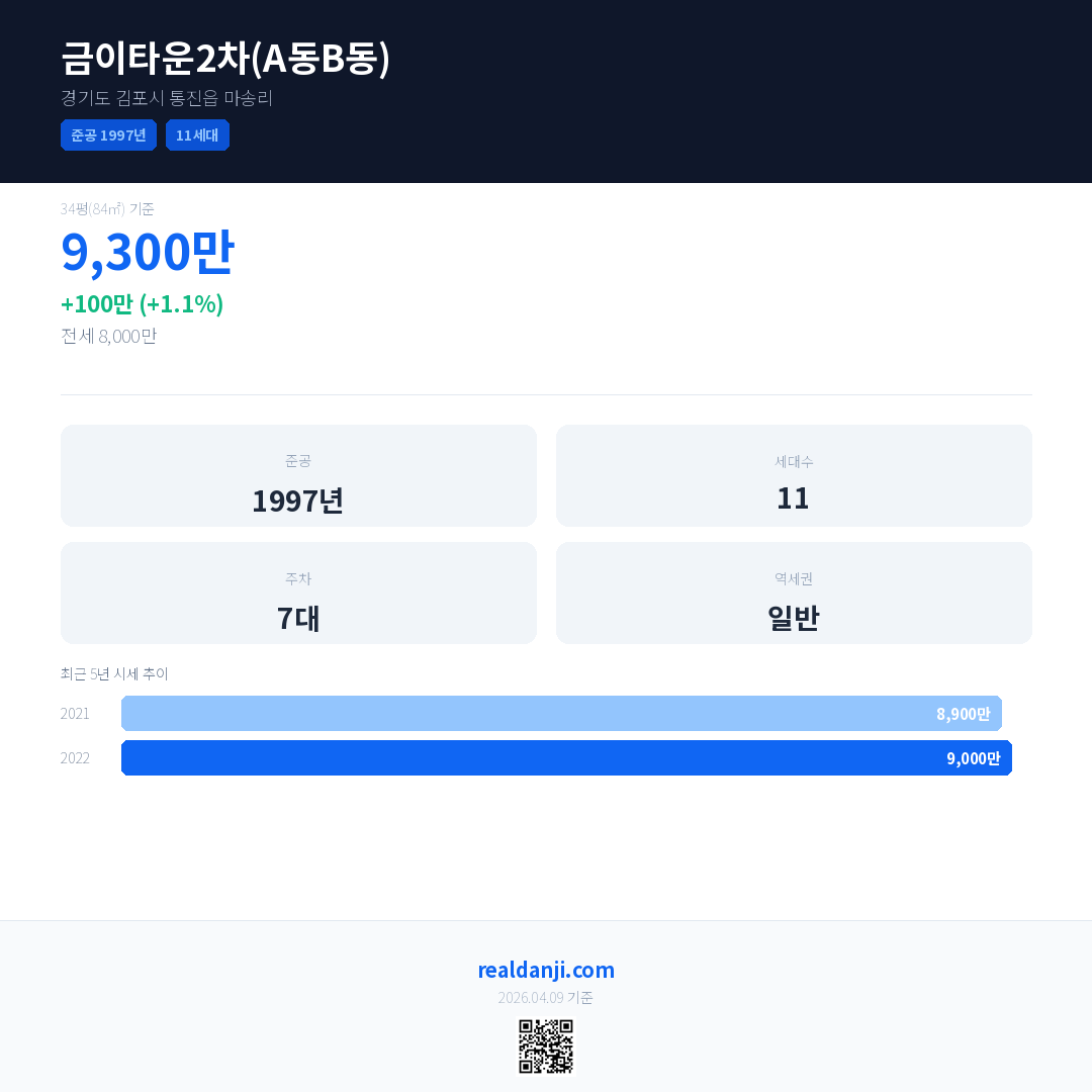 금이타운2차(A동B동) 최근 거래가는 9,300만입니다. (2024-02)