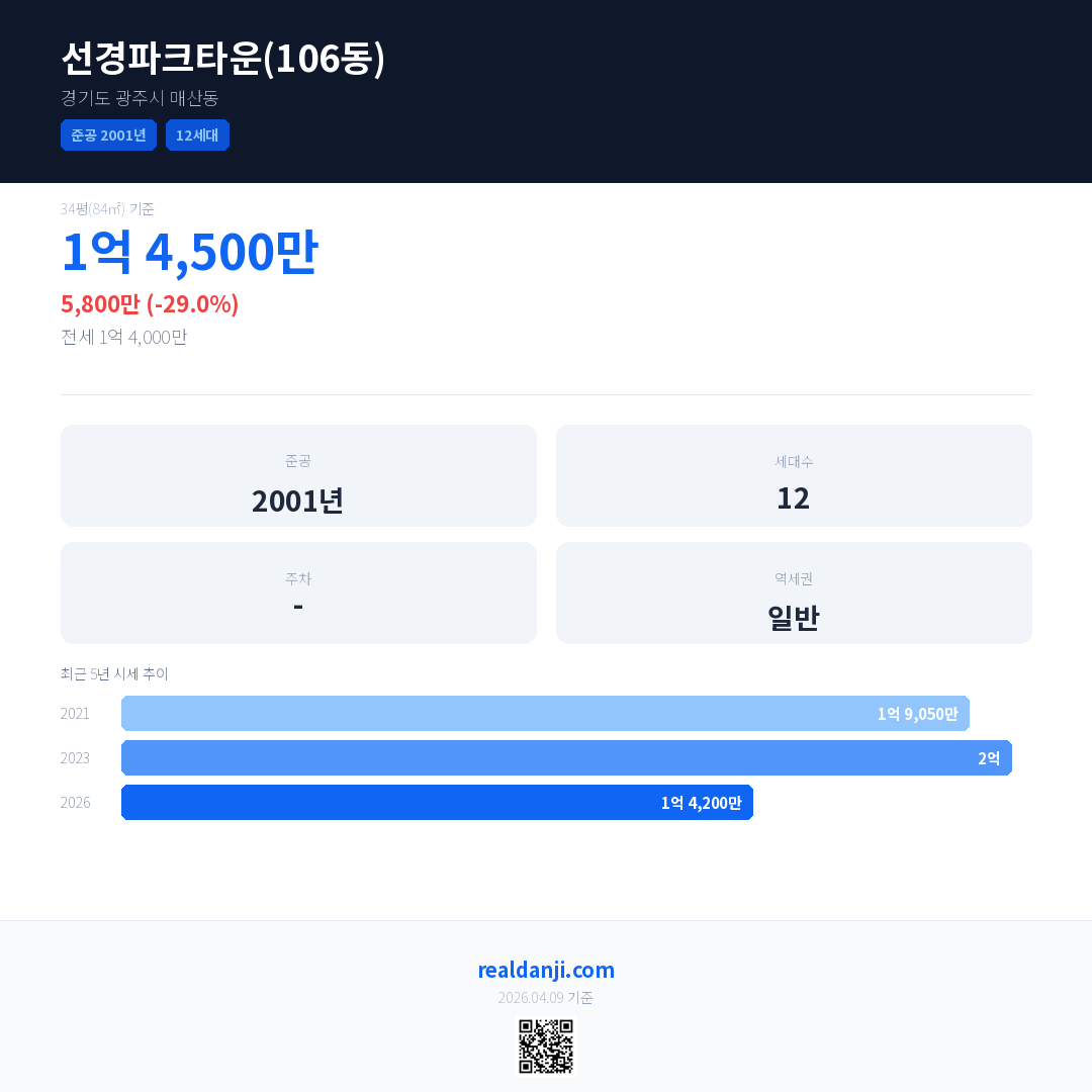 선경파크타운(106동) 국민평형 기준 2026년 평균 거래가는 1억 4,200만으로, 전년 대비 29.0% 하락 했습니다.