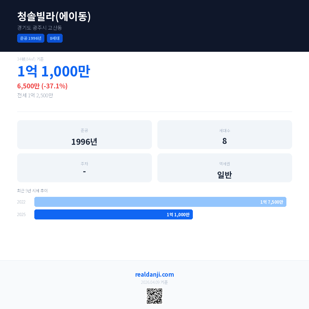 청솔빌라(에이동) 국민평형 기준 2025년 평균 거래가는 1억 1,000만으로, 전년 대비 37.1% 하락 했습니다.