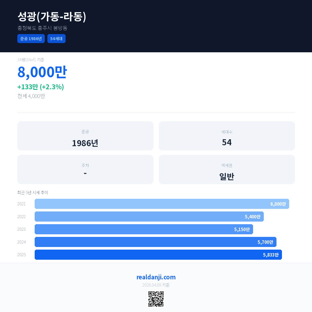 성광(가동-라동) 국민평형 기준 2025년 평균 거래가는 5,833만으로, 전년 대비 2.3% 상승 했습니다.