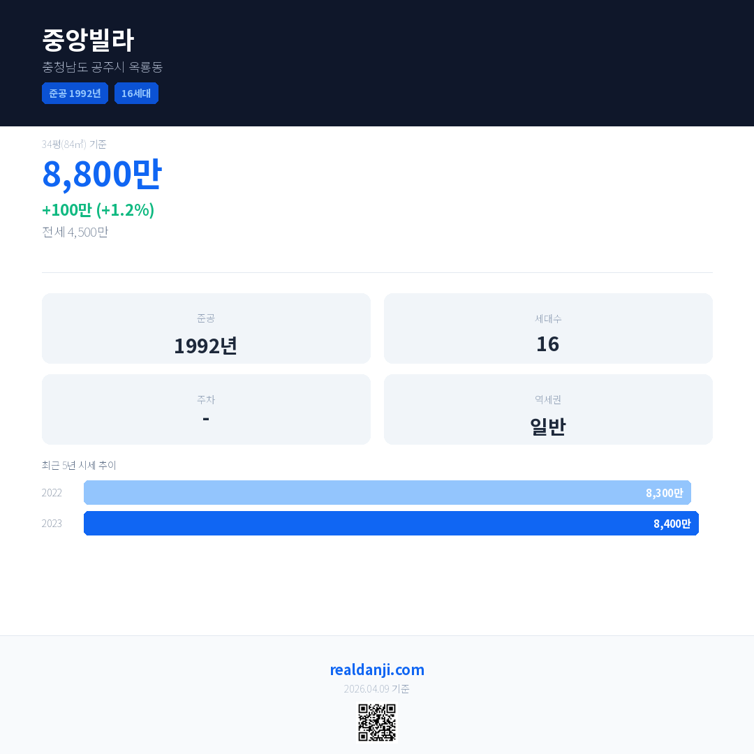 중앙빌라 국민평형 기준 2023년 평균 거래가는 8,400만으로, 전년 대비 1.2% 상승 했습니다.