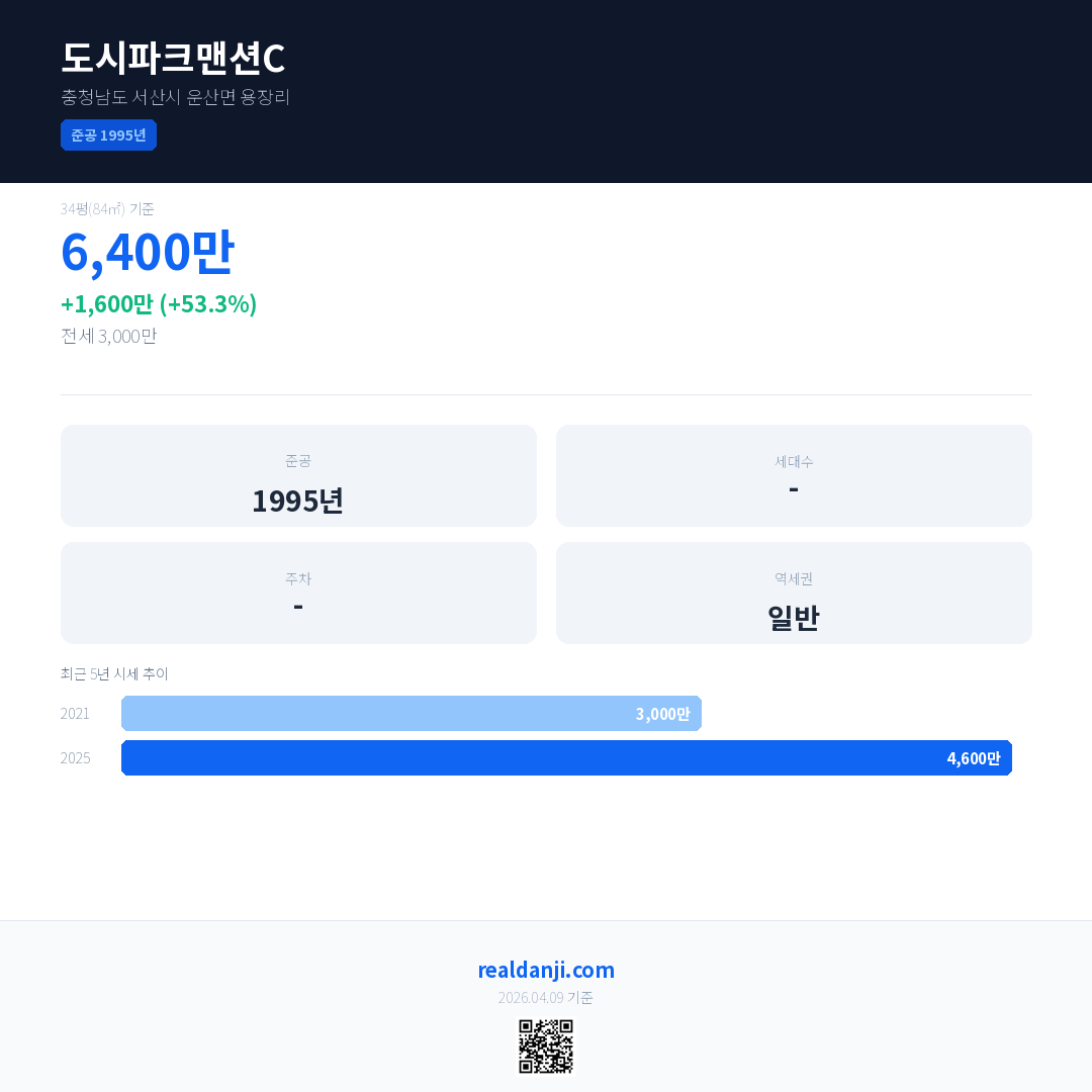 도시파크맨션C 국민평형 기준 2025년 평균 거래가는 4,600만으로, 전년 대비 53.3% 상승 했습니다.